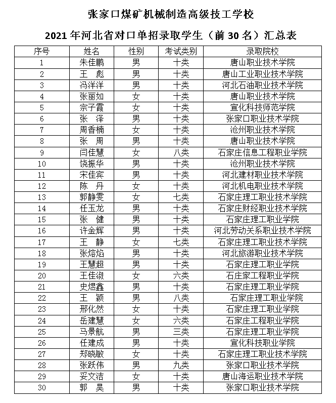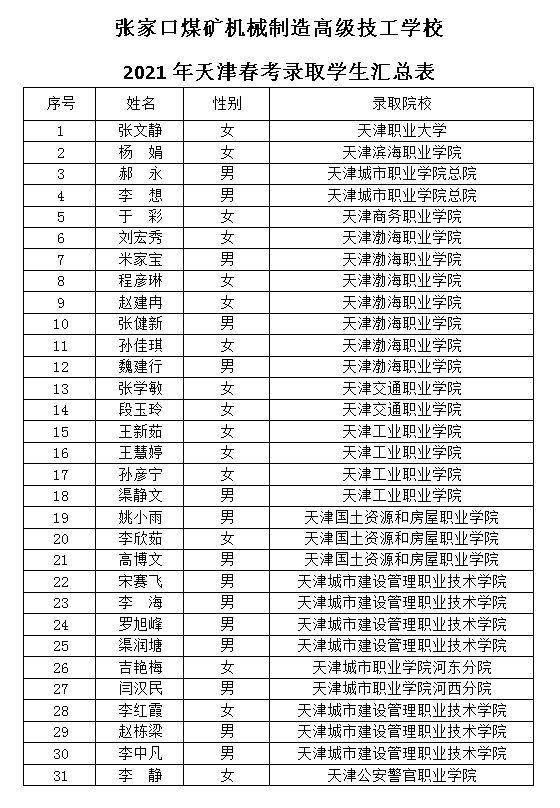 近年來,學(xué)校不斷提升辦學(xué)水平和質(zhì)量,堅(jiān)持“文化素養(yǎng)與專業(yè)技能并重、就業(yè)與升學(xué)并舉”理念,形成就業(yè)無憂,升學(xué)有道,培訓(xùn)有方的多元辦學(xué)模式。今后,學(xué)校將繼續(xù)堅(jiān)定不移抓質(zhì)量,強(qiáng)管理,全面實(shí)施素質(zhì)教育,推進(jìn)教育水平再上新臺(tái)階,為社會(huì)培養(yǎng)更多高素質(zhì)人才。 附:1.2021年天津春考錄取學(xué)生匯總表 2.2021年河北省對(duì)口單招錄取學(xué)生(前30名)匯總表