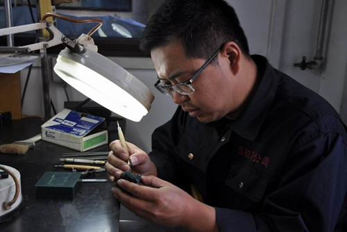 今年是徐珺工作的第20個年頭。從銅纜時代到光網(wǎng)時代,他始終如一地堅守在一線。他曾發(fā)明“暗管入戶”,成功向“暗管”管齡76年的張愛玲故居通入光纖;他提出隱形光纜理念,被業(yè)界稱為 “中國光纖接入第一人”;他關注中國線務員工作現(xiàn)狀,甘當穿越光網(wǎng)“迷宮”的引路人。2016年他的團隊中有三位同志獲得了中國電信集團安裝維護比賽的一等獎,獲得了中國電信集團公司技術能手稱號。在中國有幾十萬線務員他們長年如一日,走街串巷、翻山越嶺、日曬雨淋、爬桿布線、彎腰裝機,把現(xiàn)代信息文明帶進千家萬戶。徐珺只是他們中的一員。 四、孟劍鋒 北京工美集團握拉菲首飾有限公司鏨刻師