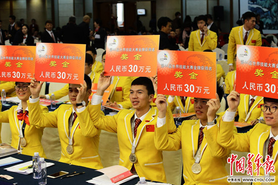 國家重獎就是要讓技能冠軍家喻戶曉 這樣的等待是值得的。 11月21日,凱旋后的第44屆世界技能大賽(以下簡稱“世賽”)代表團在分散一個月之后,又在北京集中了,參加由人力資源和社會保障部舉行的隆重表彰大會。 一個月前的10月19日,第44屆世界技能大賽在阿聯酋阿布扎比閉幕,共有來自世界技能組織68個成員國家和地區的1260余名選手參加,中國代表團獲得了15枚金牌、7枚銀牌、8枚銅牌和12個優勝獎,名列金牌榜和獎牌榜第一位。