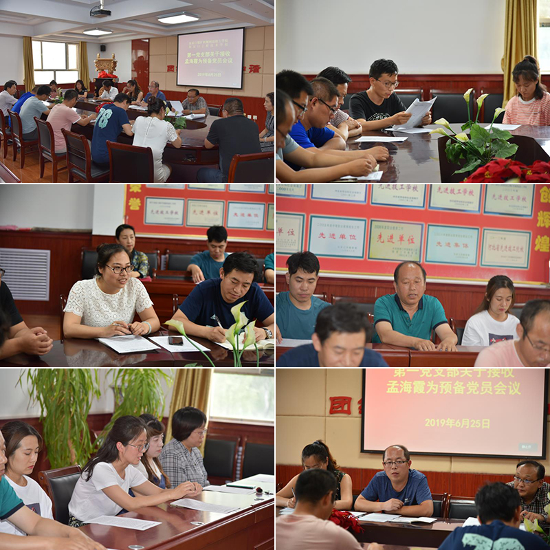 2019年6月25日,張家口煤機技校第一黨支部在綜合樓二樓會議室召開支部大會,討論關于接收孟海霞同志為中國共產黨預備黨員事宜。會議由第一黨支部組織委員王穎博同志主持。